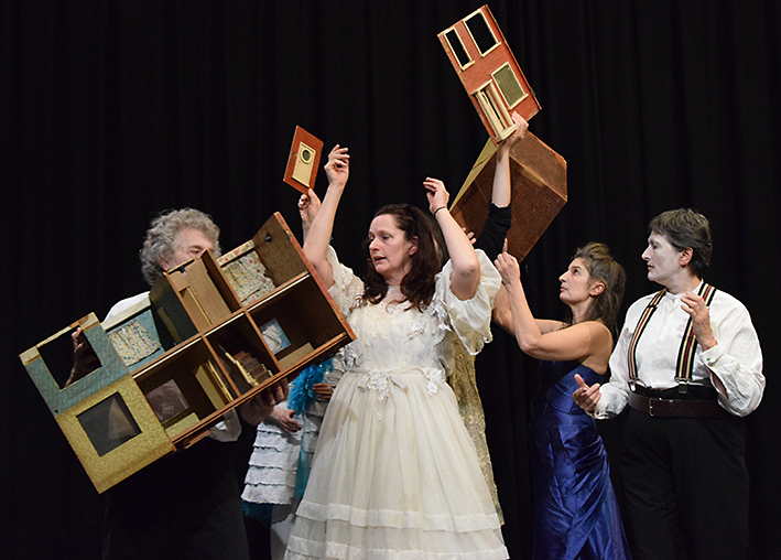 A dolls’ house appeared in our rehearsal space some time ago; we tried to trace its owner without success. Later, a bag of costumes appeared in another rehearsal space and people there assumed it belonged to us. It looked very similar to things we already own and things we might perhaps use, but it isn’t actually ours. The dolls’ house and the costumes have found us. They want to be brought into being. It is our duty to find out what they want to say … The ‘House’ is an archetypal dream symbol, much explored in Jungian therapy. It can represent the dreamer’s entire psyche or personality, with its size, state, construction, furnishings, and occupants giving a clue to the dreamer’s hopes and fears. Its rooms can represent different aspects of the self, such as the subconscious or conscious mind, or of different states of being – physical, mental, emotional, and spiritual – and their harmony or dysfunction. “… I dreamed of a dining room and a table laid for a beautiful meal… I sat at the table with strangers. In the attic a cardboard box began to flap, as the bones inside it jumped in the earth I had buried them in. They were my bones; I had chopped myself up and hidden the evidence in the box. Suddenly the door of the room blew open and a terrific gale blew through, knocking the glasses and flowers flying. In the doorway stood a small dark woman, with long tangled hair and burning eyes full of fury. She stared at me, bursting with rage but unable to cross the threshold …” (Jeannie Donald-McKim, Director) Between 2012 and 2015 we gradually began the process of teasing out and reinterpreting the tangle of meanings hidden within the walls of our Dolls’ House: location and dislocation, pattern and chaos, restriction and freedom, self, family, and the passage of time. We have worked in creative collaboration with musicians Malcolm Atkins, Bruno Guastalla, and Pete McPhail, and film-maker Dariusz Dziala. Our inspirations have been many and various, from Georges Perec’s classic novel Life A User’s Manual, which tells the story of a Parisian apartment building, to a contemporary Japanese doll-maker, who populated the landscape with her life-size creations. (See below for more, from Bruno, on the music-making.) Our R&D programme included a visit to the V&A Museum of Childhood to see their dolls' house collection and a movement workshop with international puppeteer Stephen Mottram to investigate the nature of 'dollness'. We showed work-in-progress at Diamond Night performances, and as part of the Oxford Fringe Festival in May 2015, with more new material shown at the Old Fire Station Dance Scratch nights in July and November. We were joined for this project by dancers Alex Donaghy, Alan Frank, and Andreia Morgado, who each brought a unique and beautiful movement quality and new enthusiasm to the work. We were also very grateful to have an excellent support team: Joanna Matthews (Production/Marketing), Josh Tomalin (Lighting), Dominic Hargreaves (Sound) and Fiona Sinclair (Stage Manager).