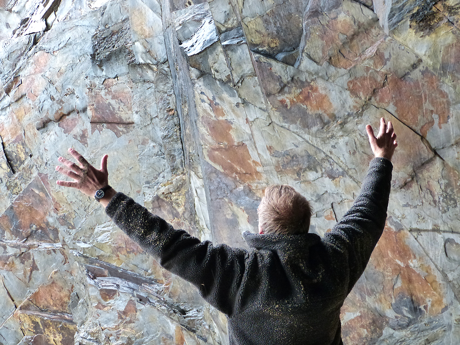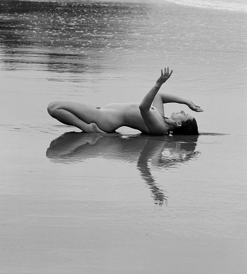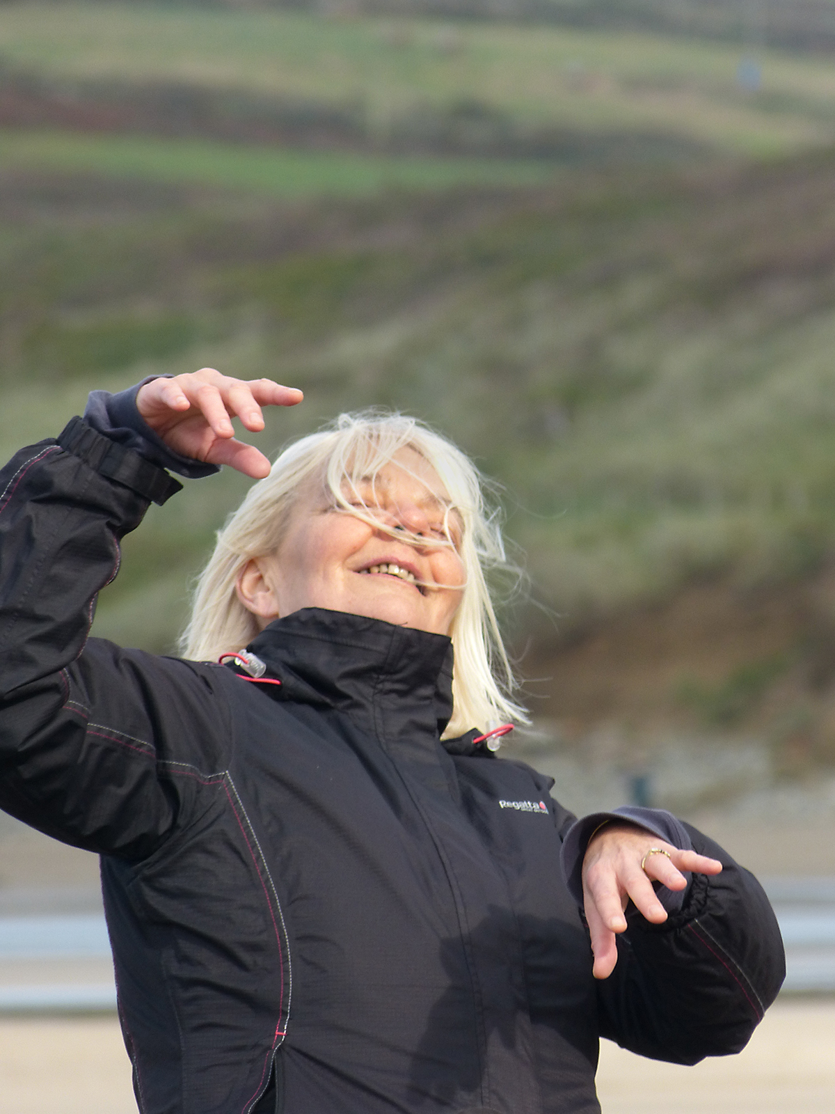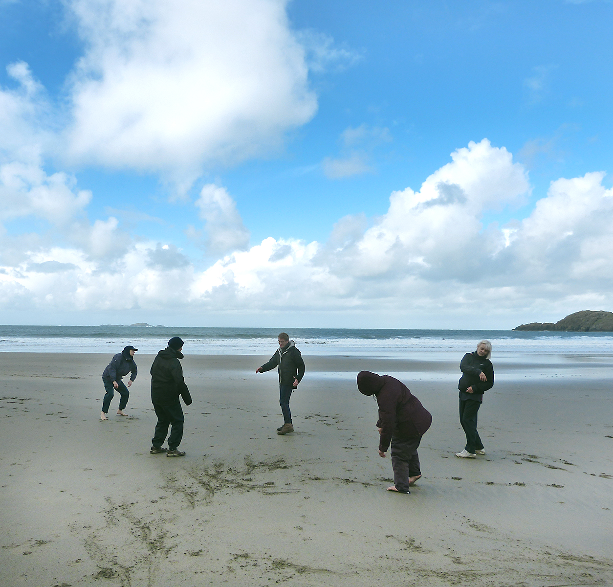 At Branscombe in Devon (2002 and 2011) and in Pembrokeshire (Marloes, 2004; Bosherston 2007; and most recently in 2016, St. David's Head), Café Reason ran down to the sea to seek out the origins of dance. At the edge of the land, at the interface between sand, rock, sea and sky, we waited for the landscape to enter our bodies. There were upended sandstone strata, testament to incredible geological forces, limestone cliffs created from the tiny skeletons of innumerable life-forms living millions of years ago, sculpted into caves, performing their own infinitely slow dance of transformation. There was the dance of the sea - the constant pull of the waves and the changing tides in thrall to the lunar cycle. There was the weather - sun and wind and temperature, and how they act upon our frail human bodies and dictate our comfort, our mood, our movement; there was the changing light, the passing of clouds, of sunshine, shadow and the cycle of day and night. There were beaches - great shelves of pebbles, slippery rocks, and sand that shifted with each storm, altering its level by meters each season. At Bosherston there was an inland landscape of water lily pools reaching down to the sea, inhabited by swans and herons, by families of coots and numberless little fish and other fresh-water creatures and plants, while at Marloes, huge flocks of starlings swept in incredible formation across the evening sky - another dance. There was flotsam and jetsam, car-wreck and sea-wrack, shells and driftwood, all moved up and down the shore in mysterious housekeeping, all subject to decay, erosion, sea-change. On the first day we explored the environment, pausing at various 'stations' along the way. At each spot we waited, and when its energy moved us we allowed ourselves to be moved. Later we returned individually to the place/s that called us, and for many hours worked with the energy of that place and our response in movement or sound. The next day we went back as a group to each person's chosen place and witnessed their dance with the elements. Jeannie Donald-McKim     Rock dancing (Marloes Sands, Pembrokeshire)