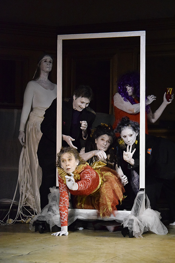 Doorway, a new piece, opened with a bride walking in slow, measured butoh steps down the aisle, dressed in white and pulling in her wake a ‘veil’, not of lace, but of long ropes hefting stones. A retinue of characters evoking cabaret and old themes of history followed dancing behind: two in high-ranking military uniform and bare feet, one in a red, skimpy, Pierrot-style outfit, another in a homespun, ragged, leaf-strewn garment, and finally one in a loose mini-dress, curly purple wig, torn lace tights, and primary coloured stilettos on which she teetered tipsily. Arrived at the altar-stage, and using the main prop of a doorway on wheels, each character in this motley tribe distilled different moves and facial expressions to create an impassioned troupe, stilled and jostling by turns, centred resolutely on the theme of crossing thresholds. Plot was avoided as their compelling movements modulated between comedy, gravitas, chaos, control, and curiosity to suggest elements of humanity’s past and its possible futures.
