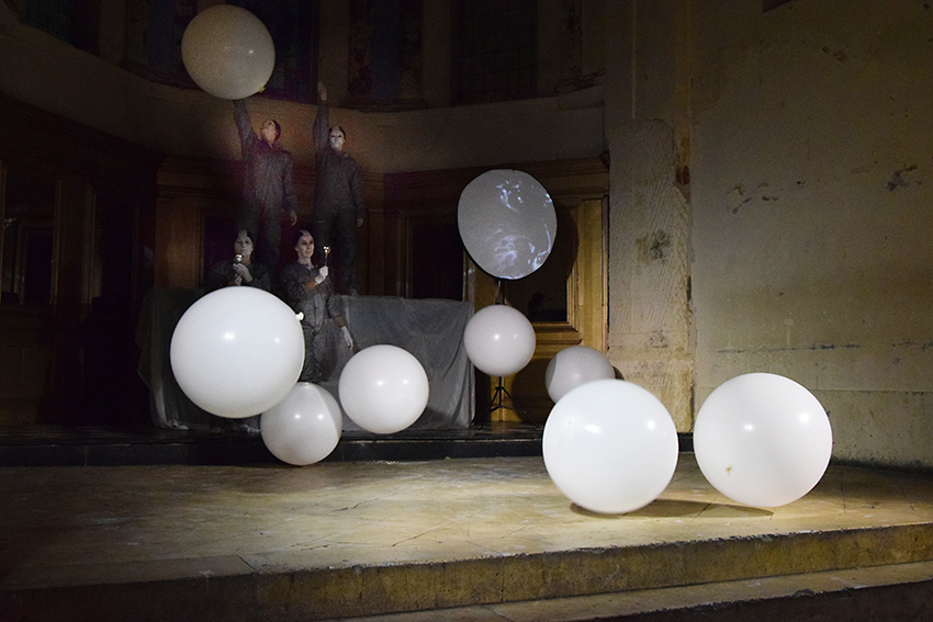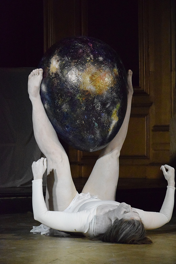 A later piece, Surviving Lunar, headed spacewards. Like all the other pieces it was aided and abetted by the haunting, mystical, music and sounds produced by the cello, percussion, saxophone, keyboard, violin, flute and bandoneon, playing at the frontiers between consonance and dissonance. Round white ‘moon’ balloons bounced up and down, and in between, this small company of astronauts, dressed in stylised, silver, space(wo)man overalls, feeling mischievously or inquiringly for shapes in a limbo land of no gravity, then modulating into more coordinated moves aligning with its pull. Equipped with large, shiny metal spoons, the astronauts used these as headsets, eyepatches, mirrors, bright circles reflecting spotlights back at the audience, to caress and soothe faces, and to bring solid, inanimate matter into play with its opposite, the soft and fluid.